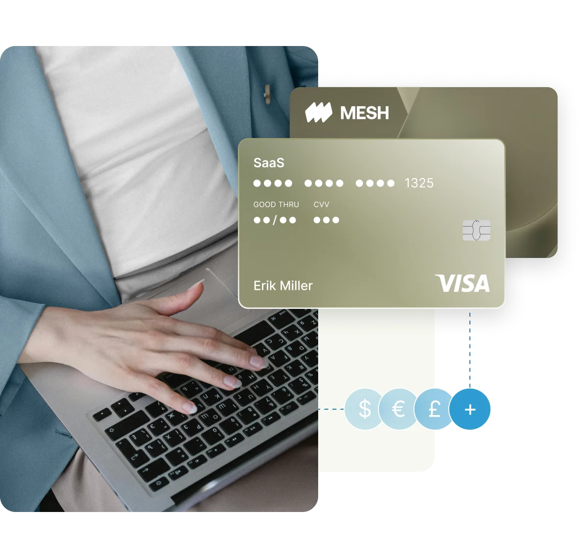 Mesh Payments virtual cards can be used for online purchases and linked to digital wallets like Apple Pay and Google Pay. Virtual cards can also be linked in a matter of seconds to any physical Plug & Pay™ card for in-person purchases.